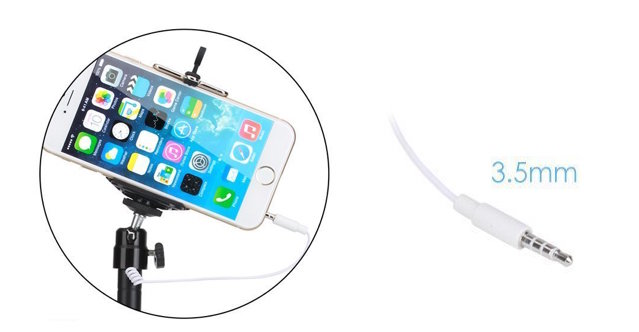 Данная модель монопода не оснащена Bluetooth управлением, но имеет кабель Jack 3.5mm для подключения к телефону через разъем наушников. Работает система по принципу гарнитуры, и производит спуск затвора как бы иммитируя изменения громкости.