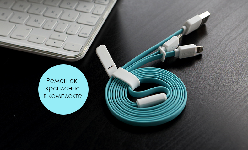 Кабель плоский (лапша) поэтому его очень удобно сворачивать и носить с собой, к тому же в комплекте имеется специальные ремешок, которым можно закрепить скрученный кабель. Такой повод не запутается, если носить его в рюкзаке или сумке.