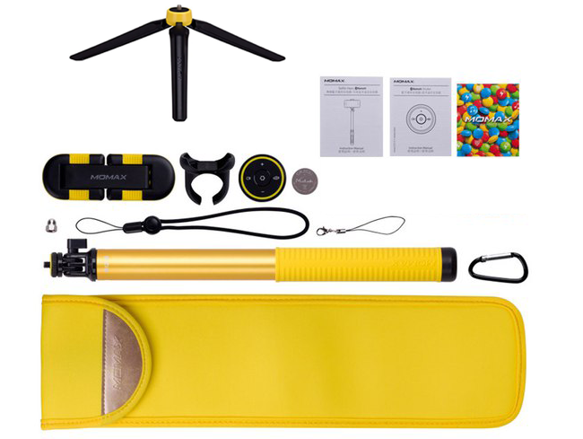Для максимального удобного управления съёмкой с помощью приспособлений из набора к ним прилагается универсальный съёмный Bluetooth-пульт. Пульт может управлять фото-спуском, начинать и останавливать запись и воспроизведение видео, управлять зумом, переключать камеру с задней на фронтальную. Чтобы пульт работал полноценно, необходимо скачать специальное приложение Momax Cam с App Store или Google Play.