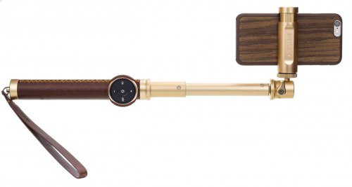 Этот комплект отличается роскошным подарочным оформлением - ручка монопода отделана кожей, из которой также сделан ремешок и клапан чехла. Крепление и раздвигающаяся часть палки для селфи сделаны из прочного анодированного алюминия, покрытие которого имитирует драгоценные металлы - золото, серебро, родий. Упаковано все в подарочную коробку из плотного матового картона, на которую надета часть упаковки с полезной информацией.