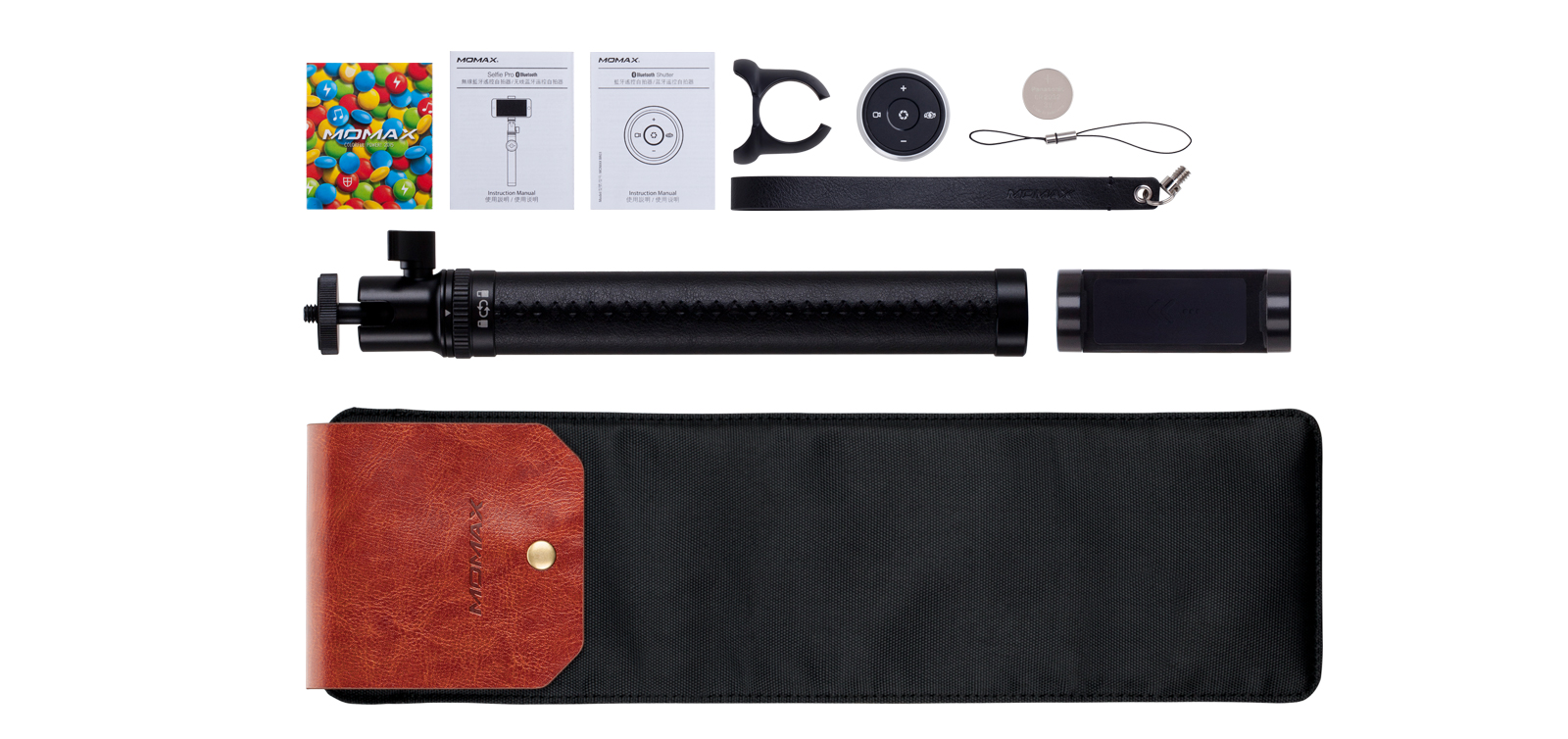 Подарочная версия набора 2 в 1 от Momax. В набор входит монопод-держатель для смартфона или камеры ,и компактный штатив-тринога - всё что нужно для идеального селфи, фотографий с вечеринок и путешествий. В комплекте также имеется чехол для монопода, ремешок на руку, съёмный Bluetooth-пульт управления и крепление для него.