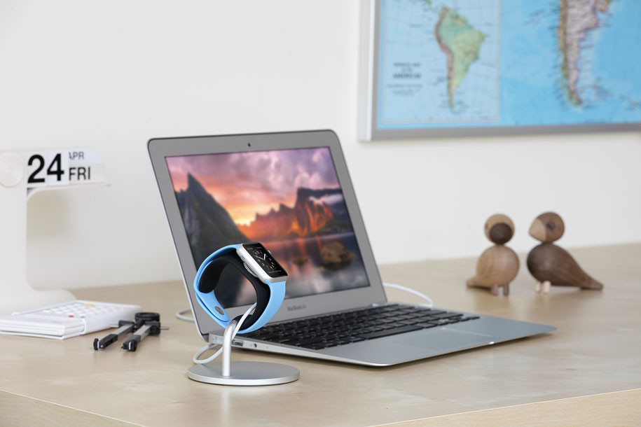 Подставка изготовлена из серебристого матового алюминия, характерного для многих гаджетов Apple, та же часть, на которую непосредственно надеваются часы, сделана из матового черного пластика с приятным на ощупь покрытием Soft Touch. Минималистичный дизайн подставки делает его достойным дополнением рабочего стола, не только полезным, но и эстетичным. Конструкция создает ощущения того, что Apple Watch парят в воздухе над поверхностью стола.