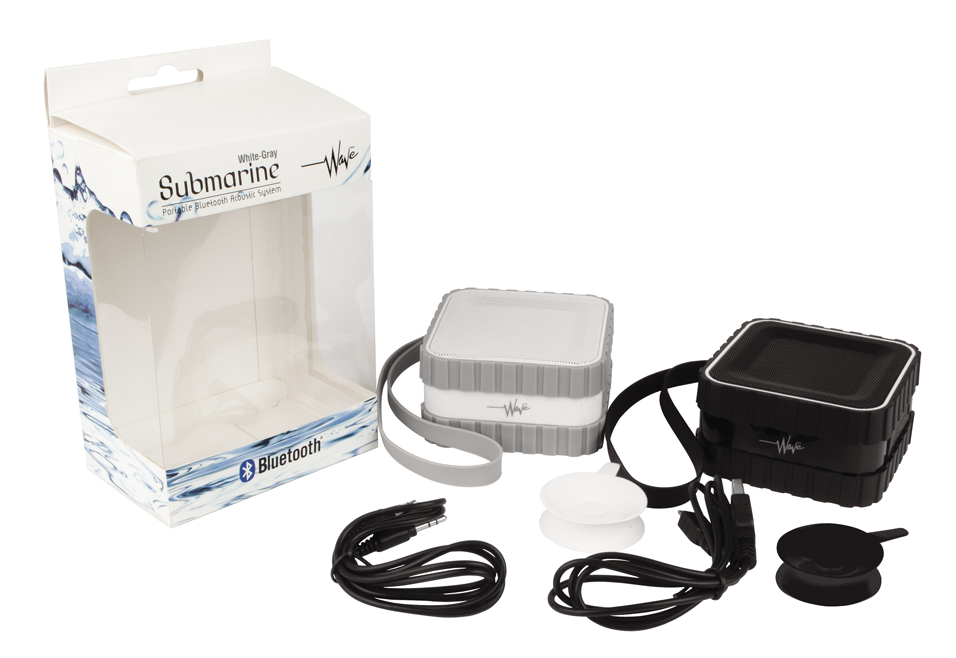 Портативная влагонепронецаемая акустика с Bluetooth и креплением-присоской. Динамик выдает чистый динамичный звук с объемными басами. Аудио-сигнал можно передавать по Bluetooth или через стандартный разъем Jack 3,5 mm и кабеля, который есть в комплекте. Благодаря прорезиненному корпусу, защищающего динамик от брызг, наслаждаться музыкой из Wave Submarine можно даже ванной.